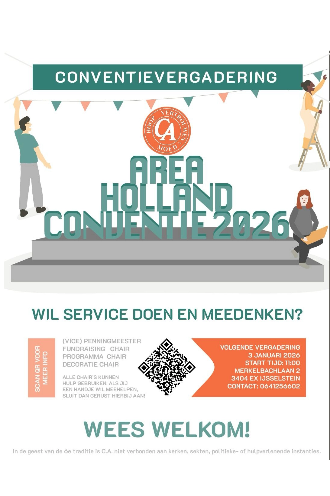 Wil je service doen en meedenken? Kom dan naar de Conventievergadering op 3 januari 2026 in IJsselstein. Je kan dan mee praten en denken over de invulling van de Area Holland Conventie 2026. Wil je meer weten? Neem dan contact op met (06) 41 25 66 02